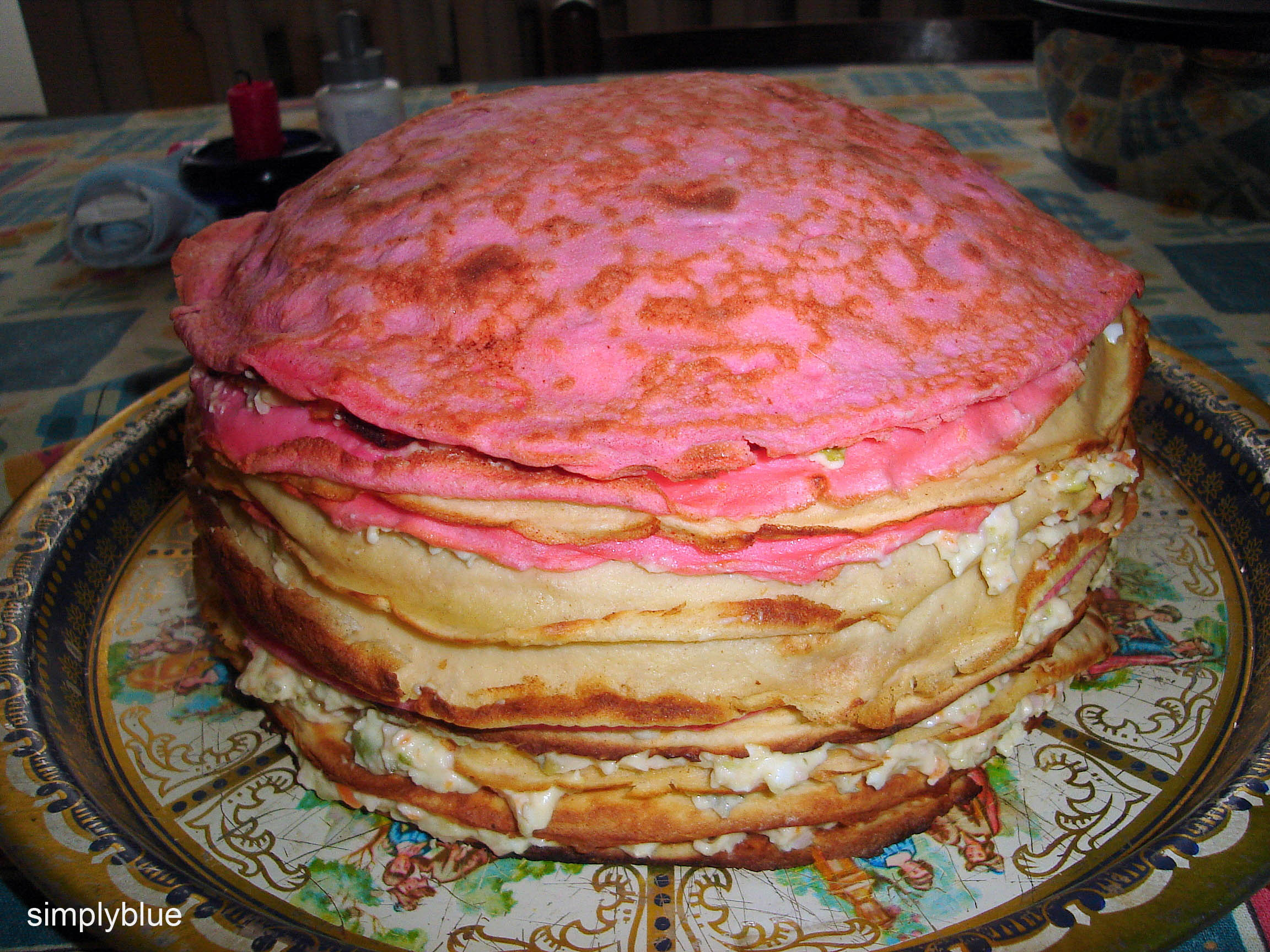 за тази торта направих 2 дози палачинки, част от тях оцветих.