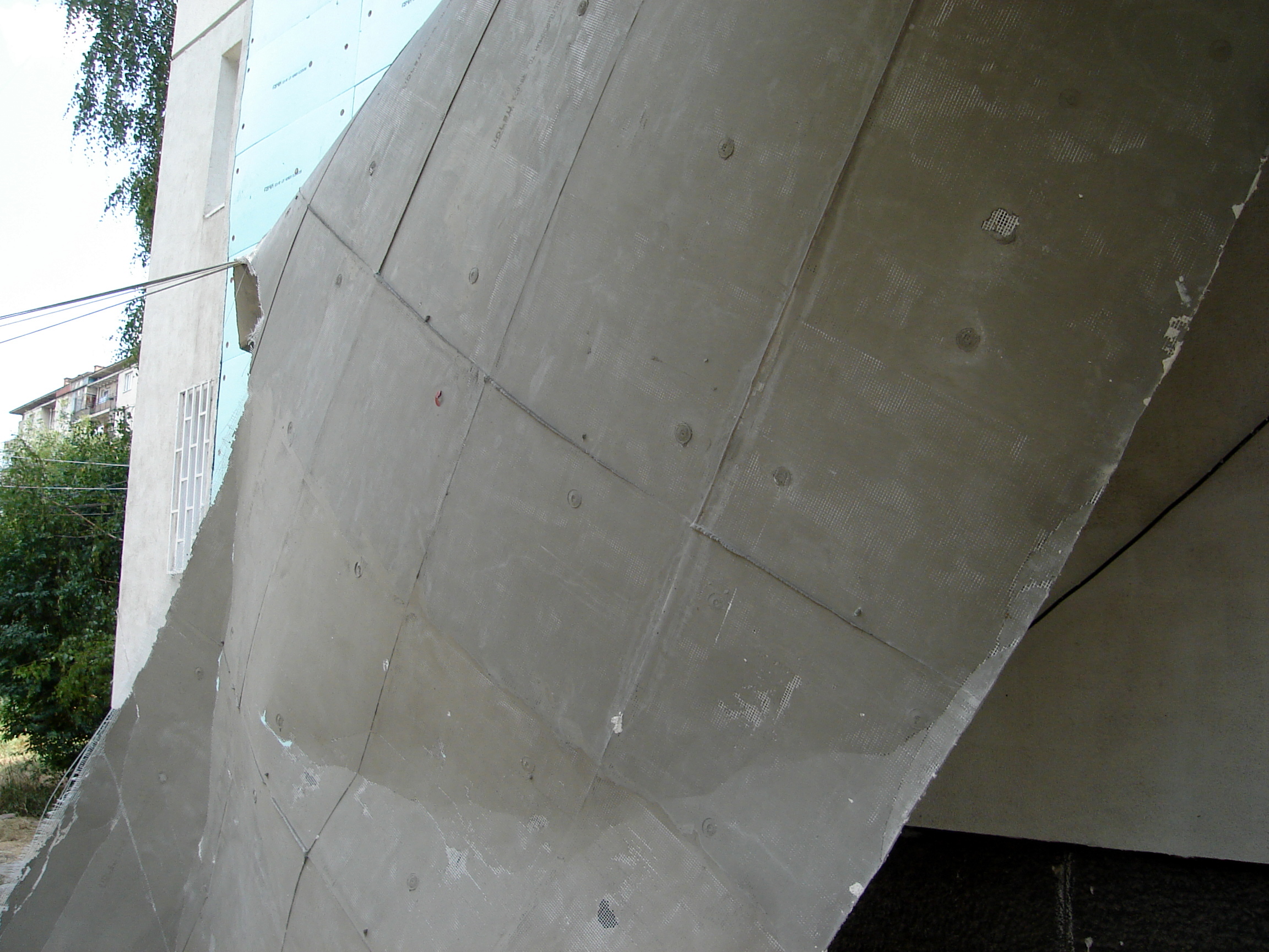 1. Според мен хората са се учили как се прави такова нещо и са объркали леко технологията. Монтирали са дюбелите и след това са сложили мрежата, а трябва обратно.
