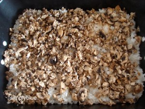ориза и гъбите се сваряват поотделно. на гъбите им трябват 5-10минути да врат в подсолена вода. ориза се разстила в обилно намазана с масло тавичка,