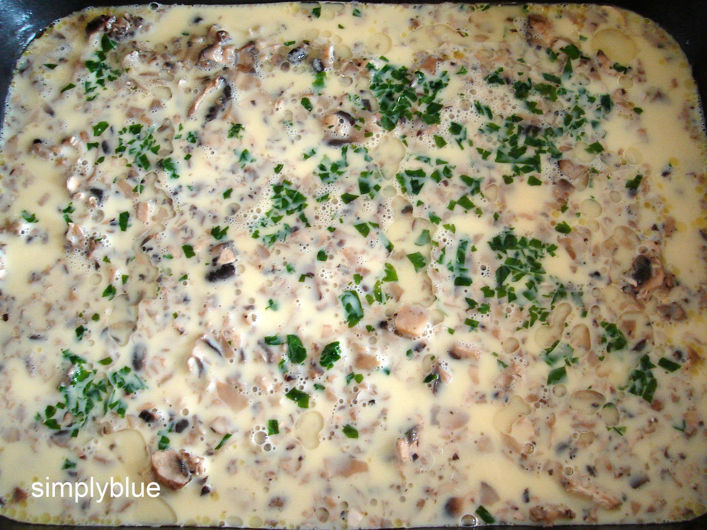 яйцата се разбиват, към тях се добавят млякото, ситно нарязания магданоз и сол на вкус. тази смес се изсипва върху гъбите. полива се с няколко с.л. мазнина.