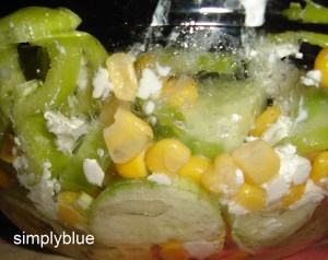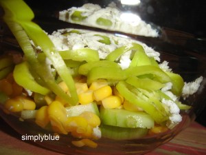 нарязваме краставицата и чушката на парчета, така както ги предпочитаме. добавяме царевицата и натрошеното сирене.