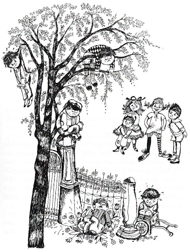 — Не бих казала, че се отнасяш добре с дамите — каза Пипи. После го вдигна със силните си ръце високо във въздуха, занесе го до брезата, която растеше наблизо, и го метна върху един клон. След това грабна второто момче и го преметна на друг клон, третото стовари върху портата на близката вила, а четвъртото запрати през оградата, тъй че то падна в цветната леха в градината. Последния побойник тя набута в една малка количка за игра, която стоеше на пътя. Накрая Пипи, Томи и Аника и Виле се полюбуваха малко на момчетата, които бяха онемели от изненада. Пипи им каза:
