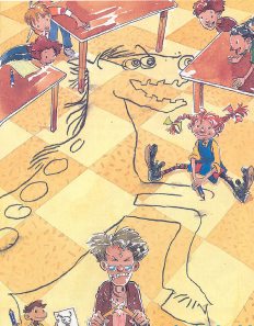 Пипи млъкна, за да си поеме дъх. Учителката вече си мислеше какво шумно и досадно дете е Пипи и предложи на децата да порисуват малко. Сигурно Пипи ще си рисува мирно и тихо, помисли тя, извади хартия и моливи и ги раздаде на децата.