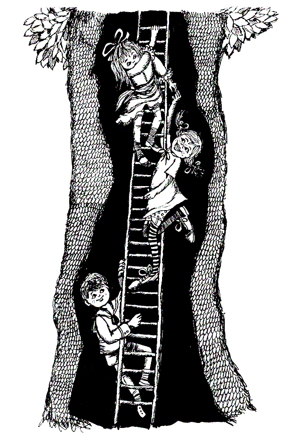 Тя се измъкна от хралупата и ловко се спусна долу на земята. После изтича за стълбата, издърпа я подире си на дървото и я напъха в хралупата.