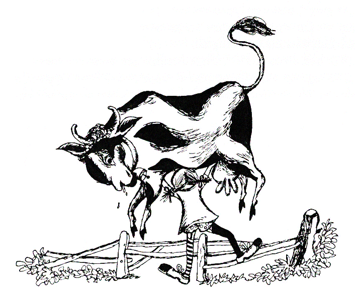 — Прощавай, че те прекъсвам — каза тя и понеже го дръпна силно, бикът се обърна, съзря още едно дете и веднага понечи да вдигне и него на рогата си.