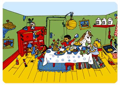 Пипи се разсмя от сърце и разтвори вратата към кухнята. Ах, че беше хубаво да влезеш на светло и топло! Празненството щеше да се състои в кухнята, защото там беше най-уютно. На долния етаж имаше само две стаи. Едната беше гостната, а там, нали ви казах, стоеше само скринът, пък другата беше спалнята на Пипи. Но кухнята беше голяма и просторна и Пипи бе я подредила чудесно. Беше застлала пода с килимчета, а масата — с нова покривка, ушита от самата нея. Бродираните цветя имаха твърде особен вид, ала Пипи твърдеше, че такива цветя растели в Индокитай и вероятно беше така. Завесите бяха спуснати и печката бумтеше. Господин Нилсон седеше върху сандъка за дърва и думкаше с два капака, а по-нататък, в ъгъла, стоеше конят. То се знае, че и той беше поканен на празненството.
