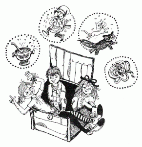Когато се случваше дъждовно време, децата трябваше да останат в къщата, но и тогава не скучаеха. Понякога разглеждаха чудните неща в чекмеджетата на скрина, а друг път седяха пред печката и наблюдаваха как Пипи пече вафли или ябълки, или пък се вмъкваха в сандъка за дърва и слушаха разказите на Пипи за опасни приключения от времето, когато кръстосвала моретата.