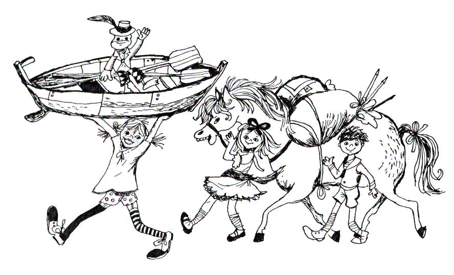 Тя спусна лодката във водата, разтовари коня и сложи всичко на дъното на лодката. Аника, Томи и Господин Нилсон скочиха вътре. Пипи потупа коня: