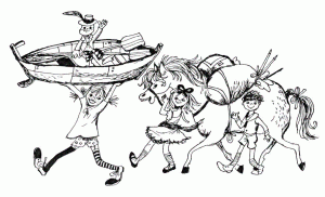 Тъй и стана. Ела изчезна и два часа по-късно Пипи, Томи, Аника, конят и Господин Нилсон потеглиха към пустия остров.