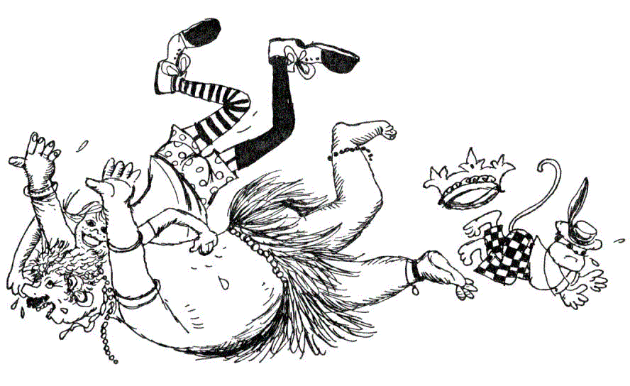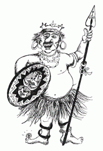 И изведнъж — тряс! — вратата се отвори и пред тях застана негърският крал. Беше облечен с пола от лико, на главата имаше златна корона, около шията му висяха много нанизи. В едната си ръка държеше копие, а в другата — щит. Това беше всичкото му облекло. Изпод полата се подаваха два дебели космати крака със златни гривни на глезените.