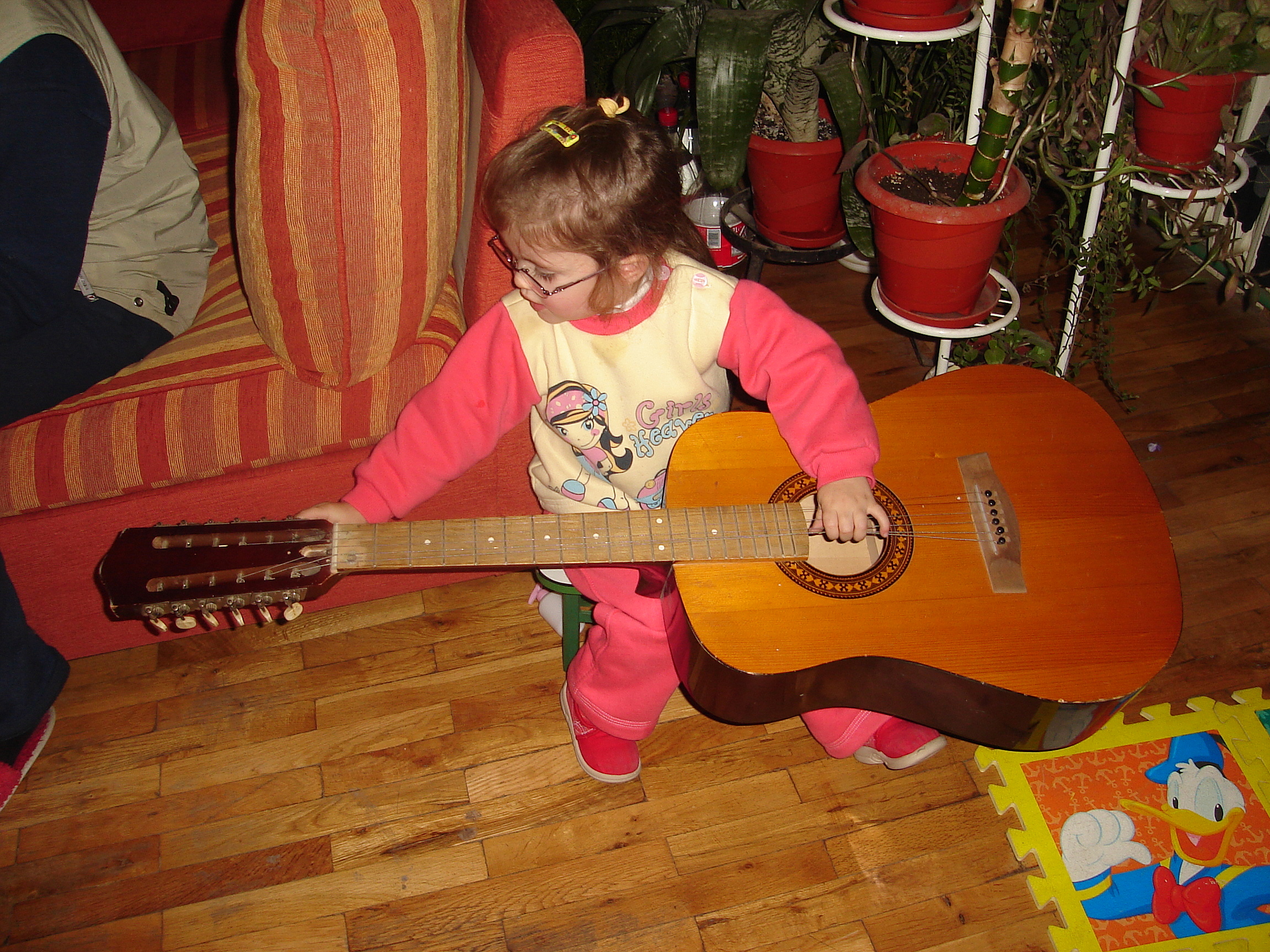 прибира се Ния от двата почивни дни на вилата с баба си и дядо си. след има-няма час тя отива при китарата до камината и започва да свири. след което я взима (китарата), която е по-висока от нея, сяда на стола и започва да ми пее и свири. ей така се ококорих 😯 първо аз, а после и батето.